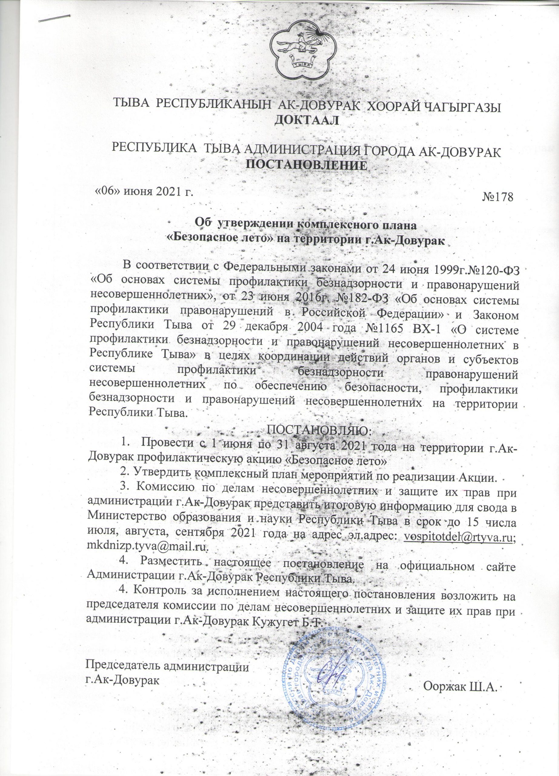 Постановление администрации от 06.06.2022г № 178 «Об утверждении плана «Безопасное лето» на территории города